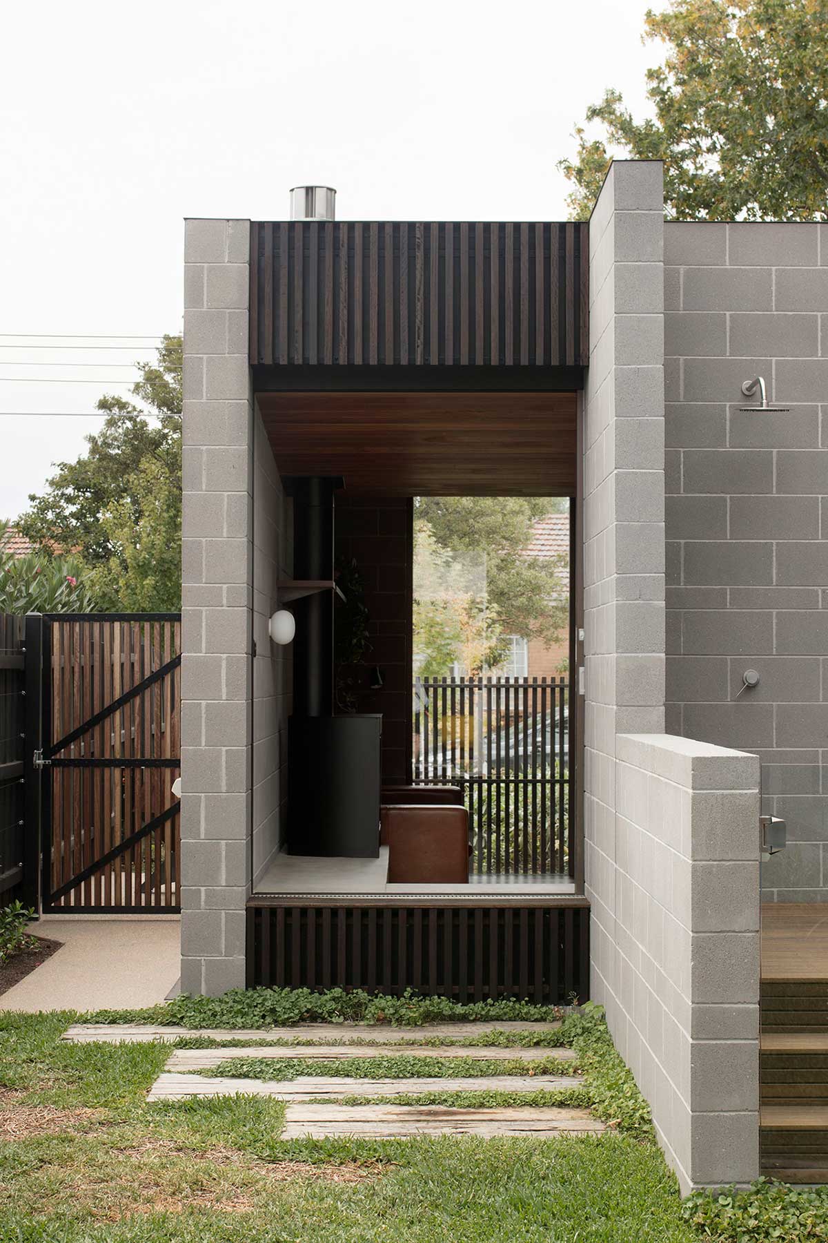 “Formally from the street, the idea was to present an architectural response that related to its context, but with clear distinction. The height of the house steps behind the front tree, to take advantage of the beautiful view of the green foliage, while at the same time, retaining a scale which is familiar for the street and context. In contrast, the textural play of the bricks and form is used to create a sculptural street gesture, finer steel portals and details create an entry garden, welcoming both the visitors and the landscape in. An open fenceless frontage, encourages the house to visually participate in the community and streetscape.” – MODO Architecture