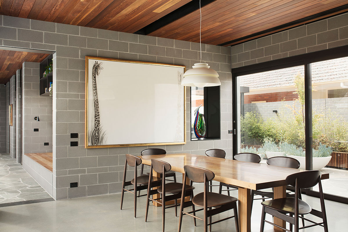 Timber cladding and concrete block wall is widely used throughout the home, creating a homely ambiance of earthy texture throughout the new spatial features that blend harmoniously with the existing structure. Levels are introduced discreetly throughout the different functional areas, creating a distinction between spaces that still feel unified altogether.
