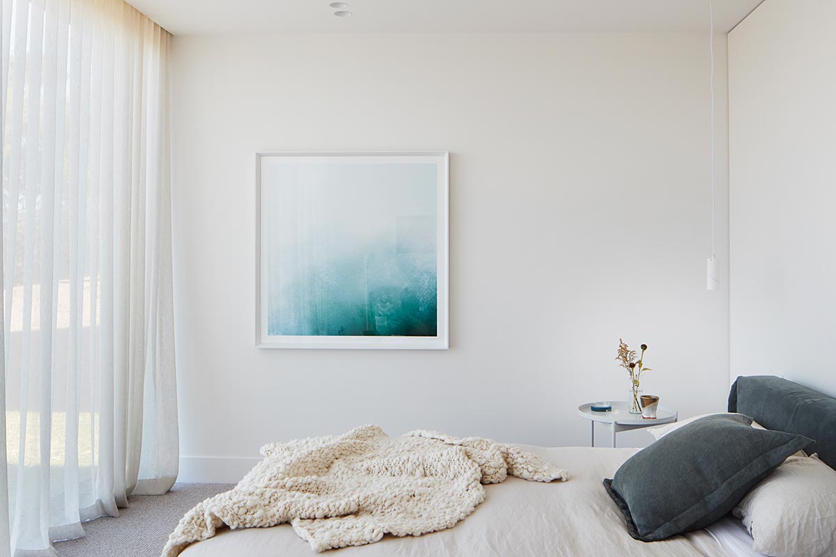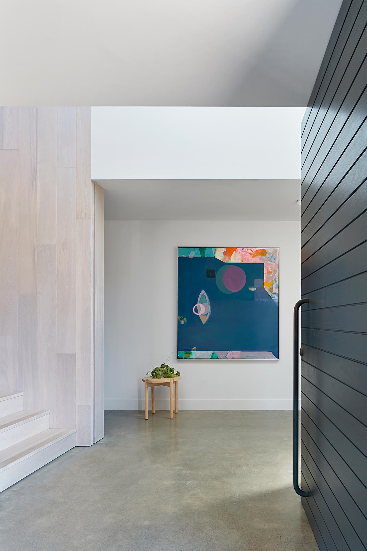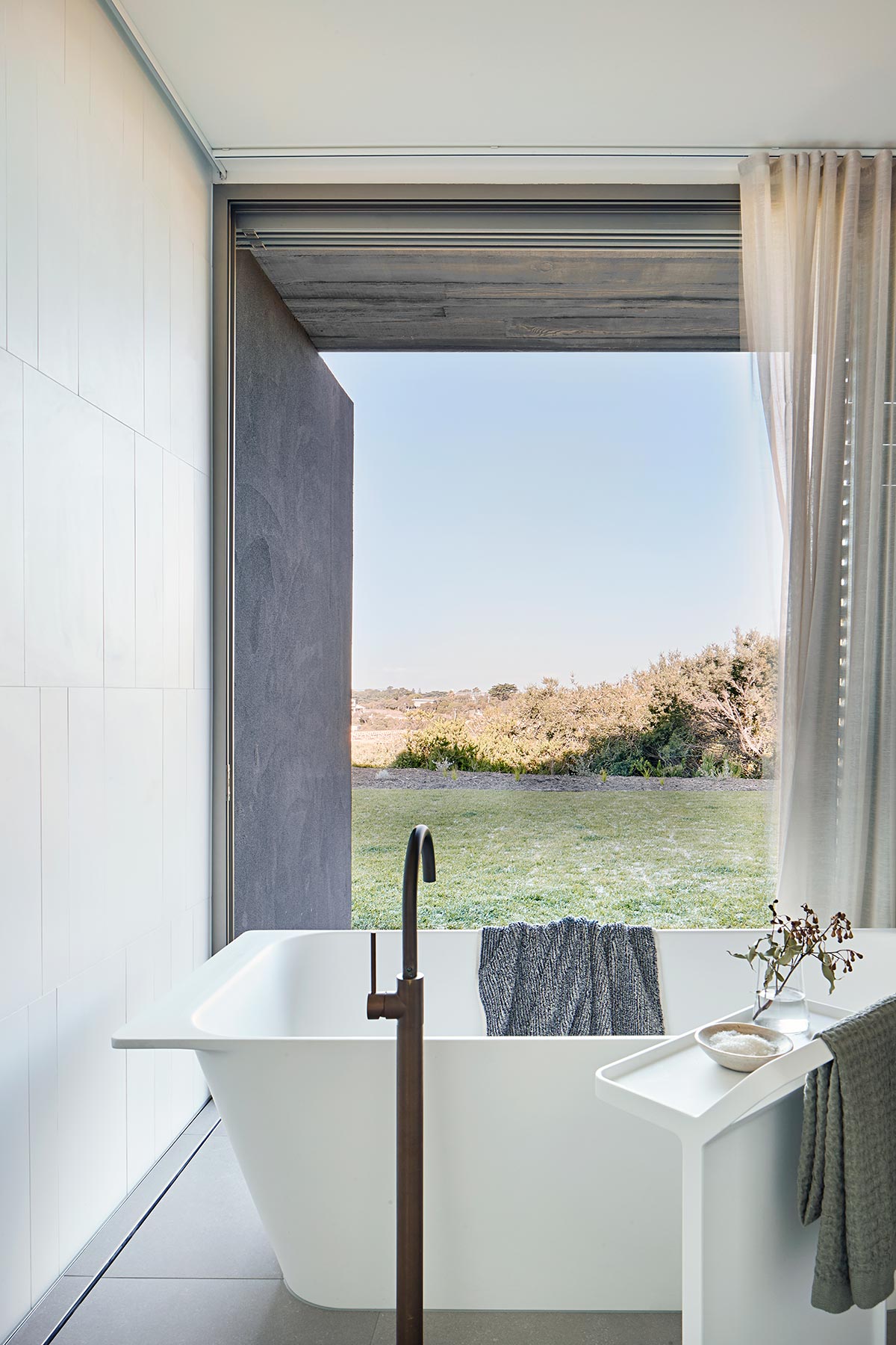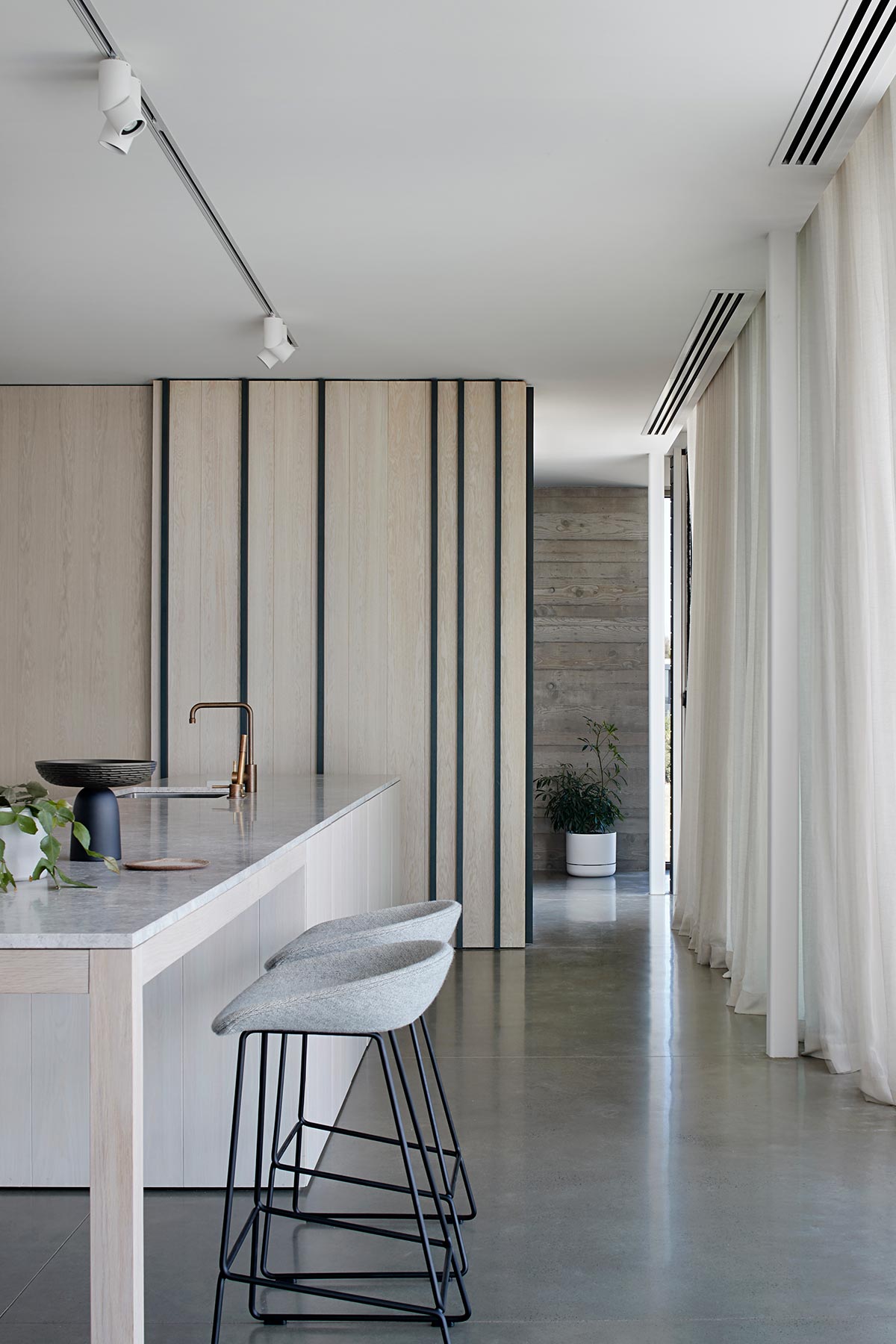 “The effort and rigour involved in details like the alignment of; light fittings with joinery, concrete patterns with door handles and tap fittings with tile layouts had to be seen but not heard. A restrained material selection reduces noise and allows specific details to shine. Random patterns of stained timber battens against white sand joinery, celebrate a beautiful imperfection and mimic driftwood awash on the shore.” – Rachcoff Vella Architecture
