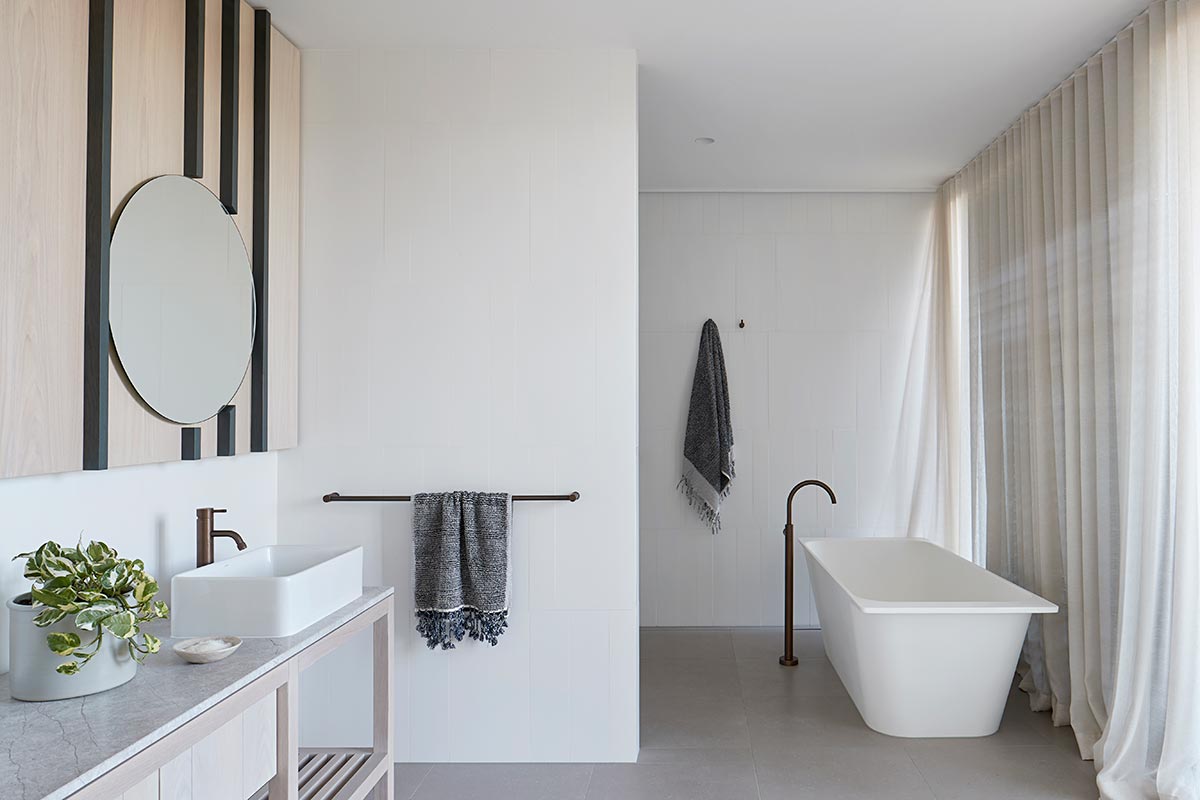 Internally, a strong coastal vibe is evident with the use of predominantly muted but beautiful modern composition of materials and finishes. This aesthetic creates the perfect balance of warmth and softness in the interiors, and allows for a seamless connection to the outdoors and the surrounding environment.