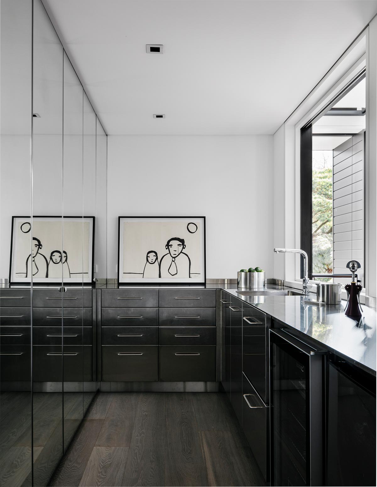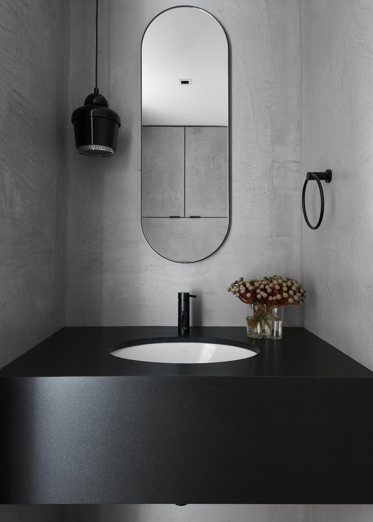 “A simple palette of natural concrete blocks, black timber boards and windows and black zinc were chosen to integrate with the park setting and not dominate the surrounding houses. These same materials return inside to bring a greater indoor outdoor connection. A lighter timber framework on the first floor helps to modulate and integrate the house with the park setting.” – Porebski Architects