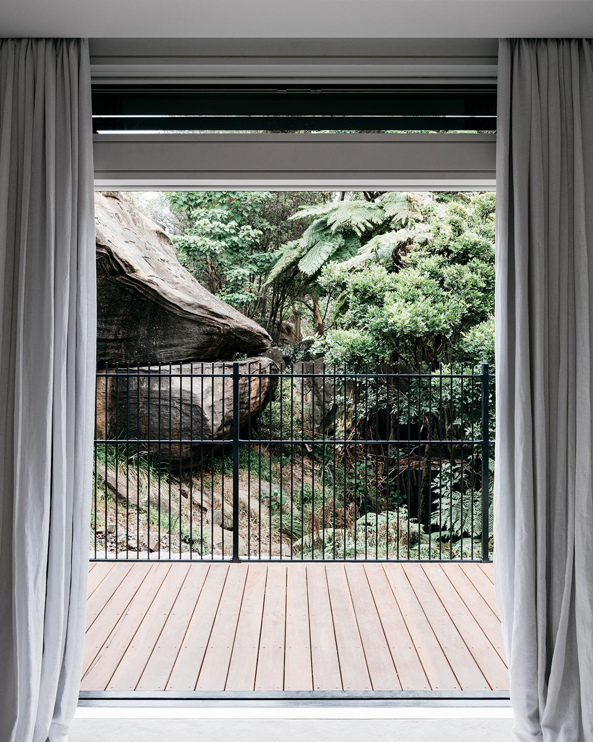 The house is built with two different areas; the service core running along the southern boundary with entrance, stairs and bathrooms; and the north-facing living core comprising four ground floor bedrooms and the upper level living, dining and kitchen. The first-floor living rooms take advantage of the volume of the roof, sun access and bush views, allowing the ground floor bedrooms to enjoy more privacy.