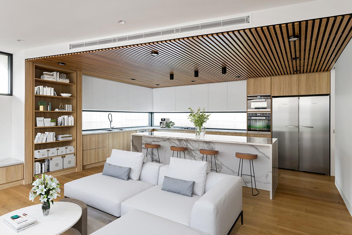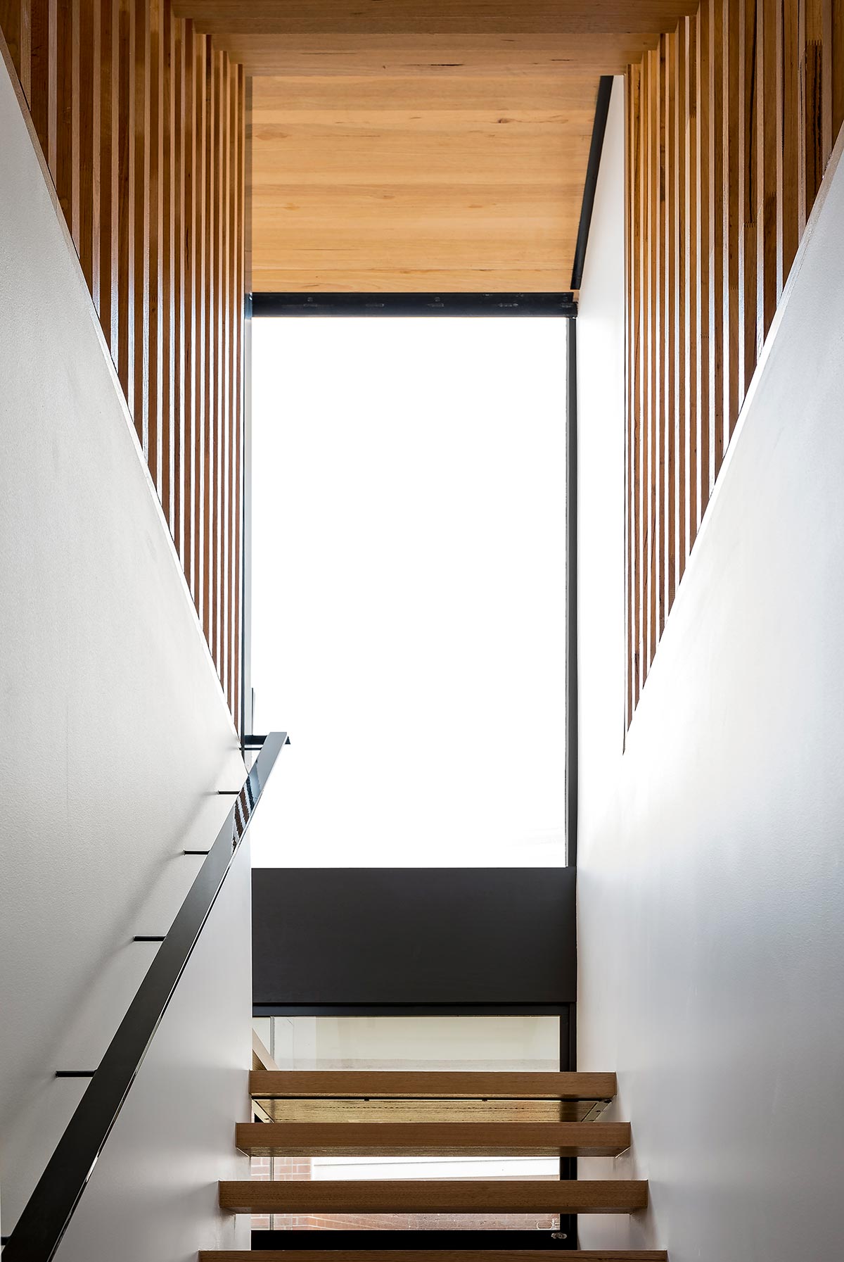 “Inside, a bespoke staircase is a striking interior feature. Designed in consultation with a structural engineer, each solid timber stair tread sits perfectly in between long vertical timber battens without the need for stair stringers. This unique staircase provides a feeling of lightness to complement the floating facade and continuous flow of internal spaces.” – Sky Architect Studio