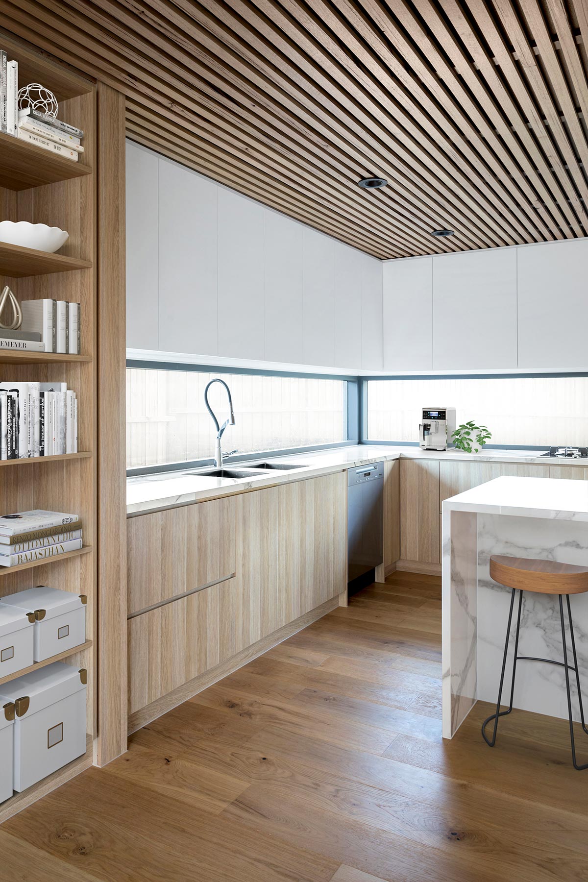 The exterior is clad with Blackbutt timber and full-height windows on the north-east facade allow passive solar thermal comfort year-round. The west facade features large eaves and highlights and slot windows with low-e glass to inhibit heat storage from the sun during summer.