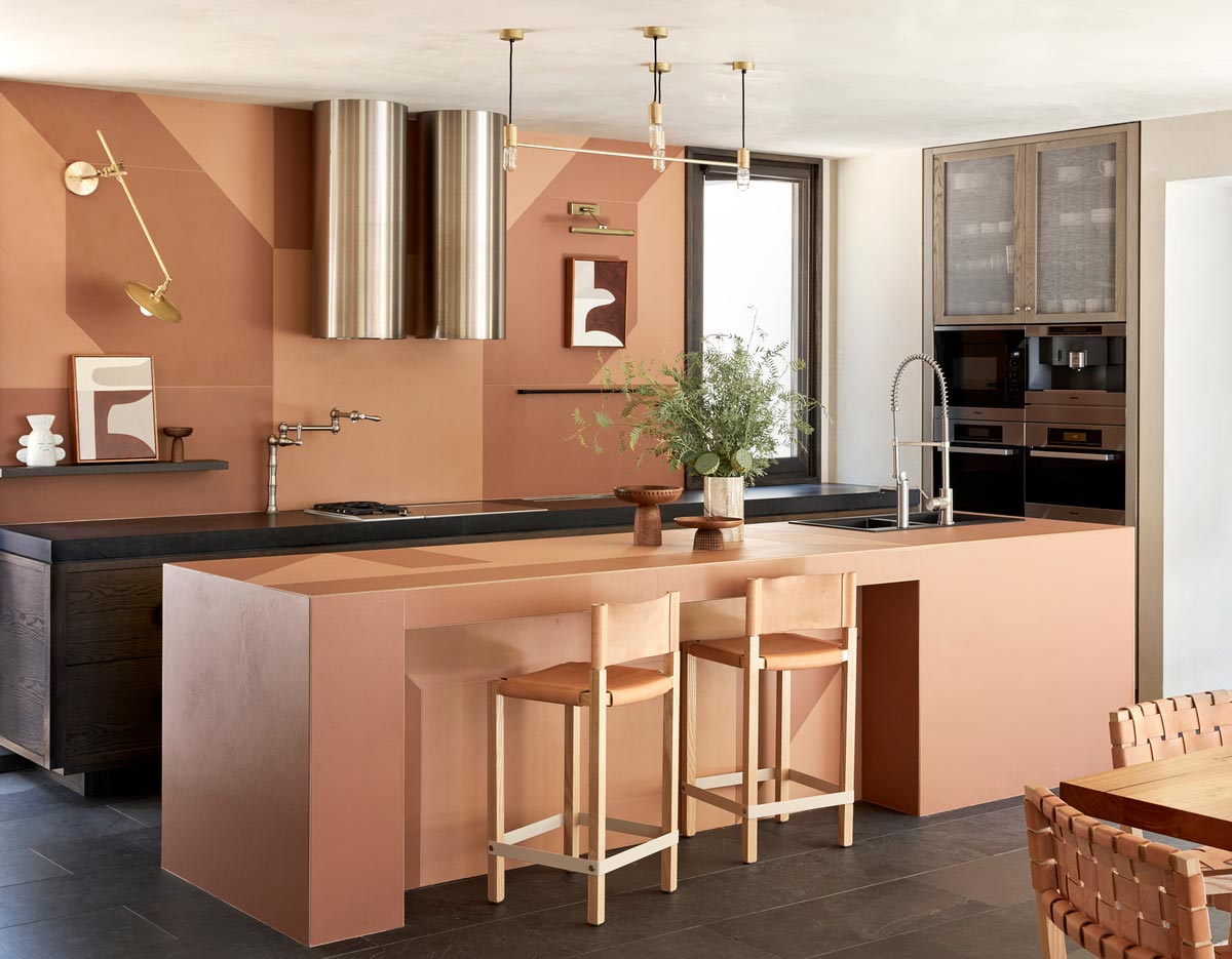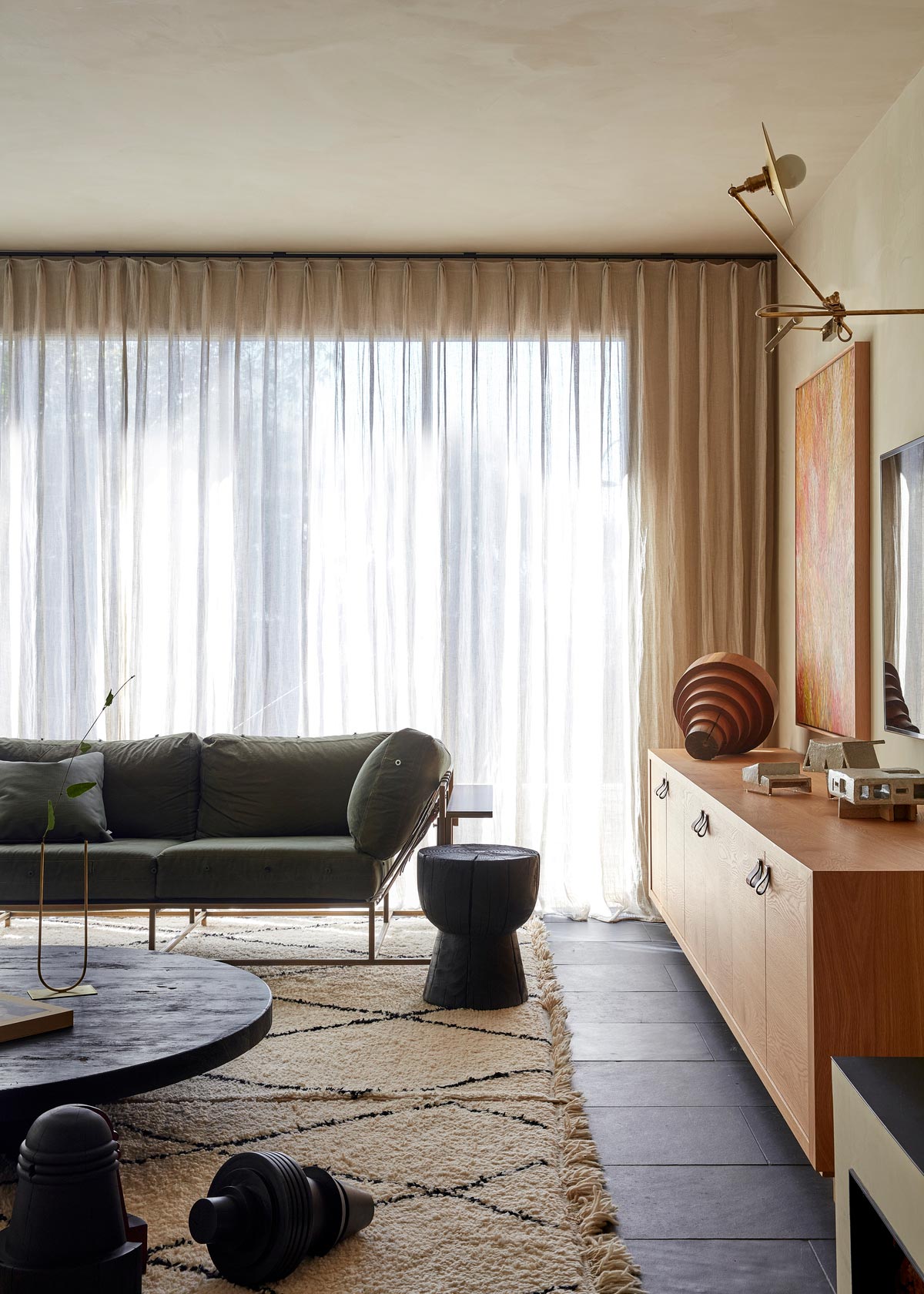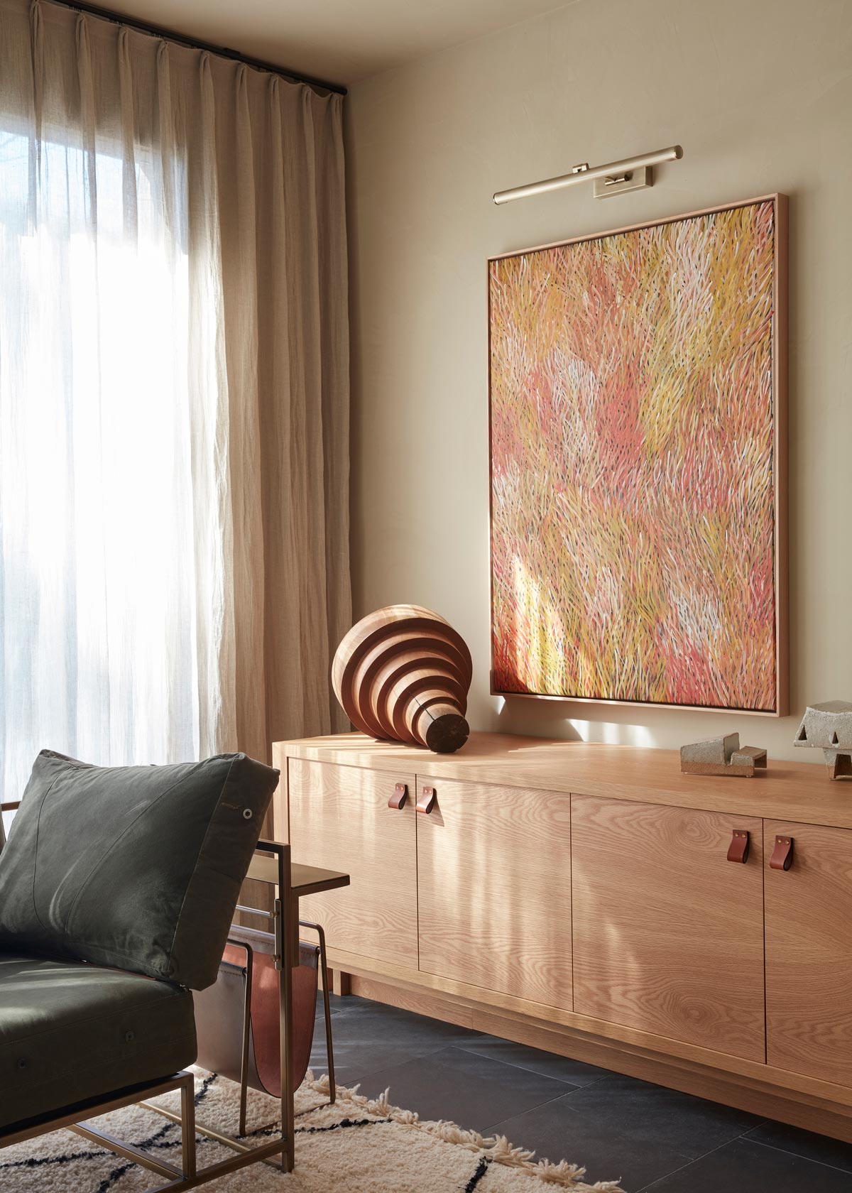 The colour palette was predominantly inspired by the magnificent colours of the valley and the surrounding landscape. Ghost greys of the eucalypts, the washed out greens of the grapevines, the terracotta blush of the soil and the blackened bark of the trees. Graphic elements like Patricia Urquiola tiles were used to wrap the kitchen walls and island bench to introduce a contemporary aesthetic to the interiors, along with the terracotta brick screen in the rumpus that throws light into an otherwise land locked hall. Texture and layering were paramount in this interior, and the hand of the artisan is felt throughout every inch of this home.