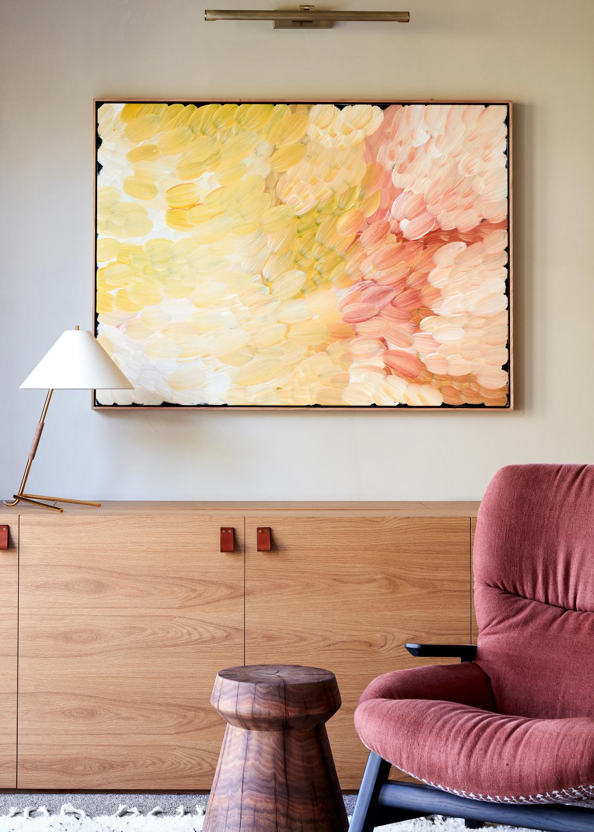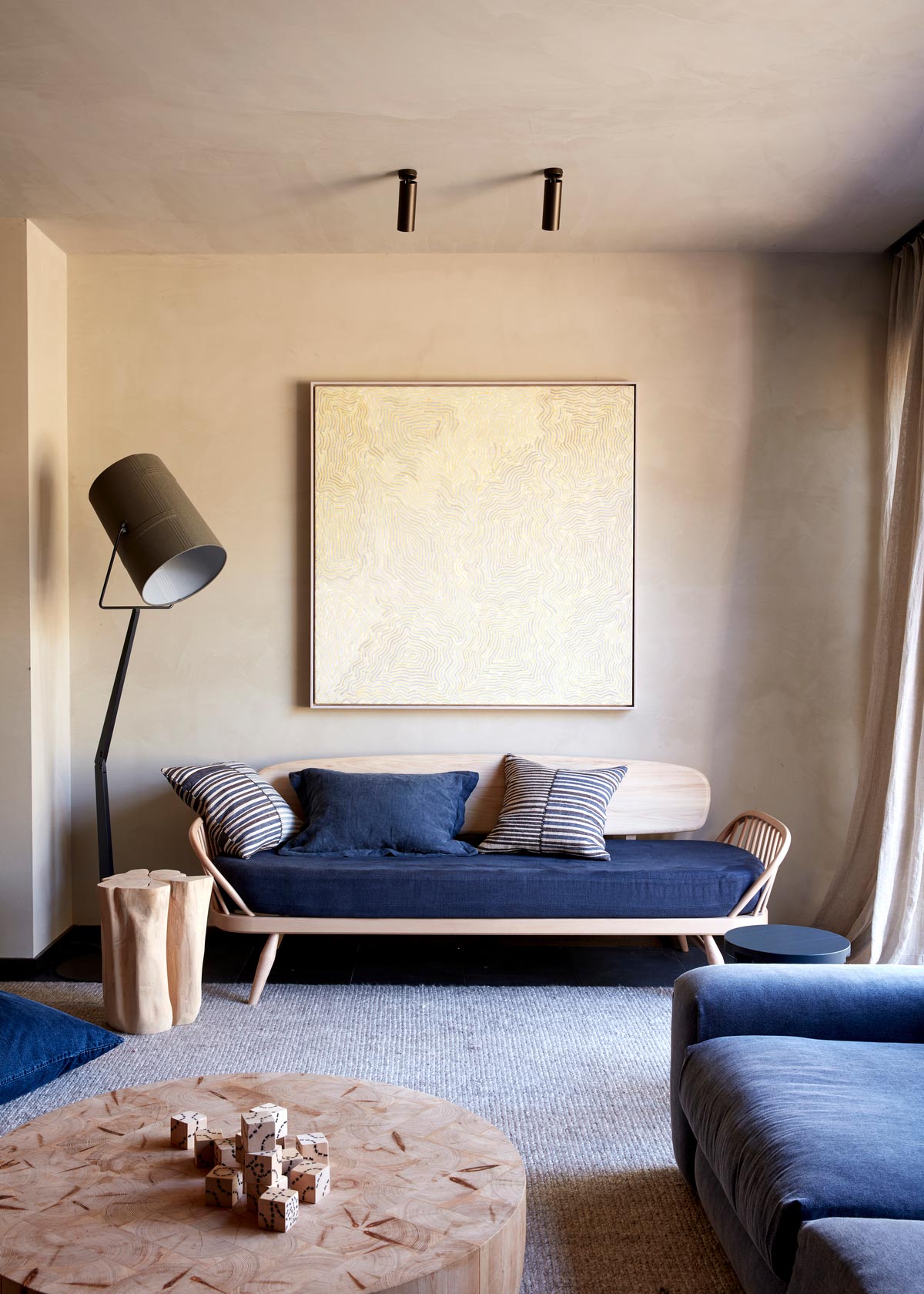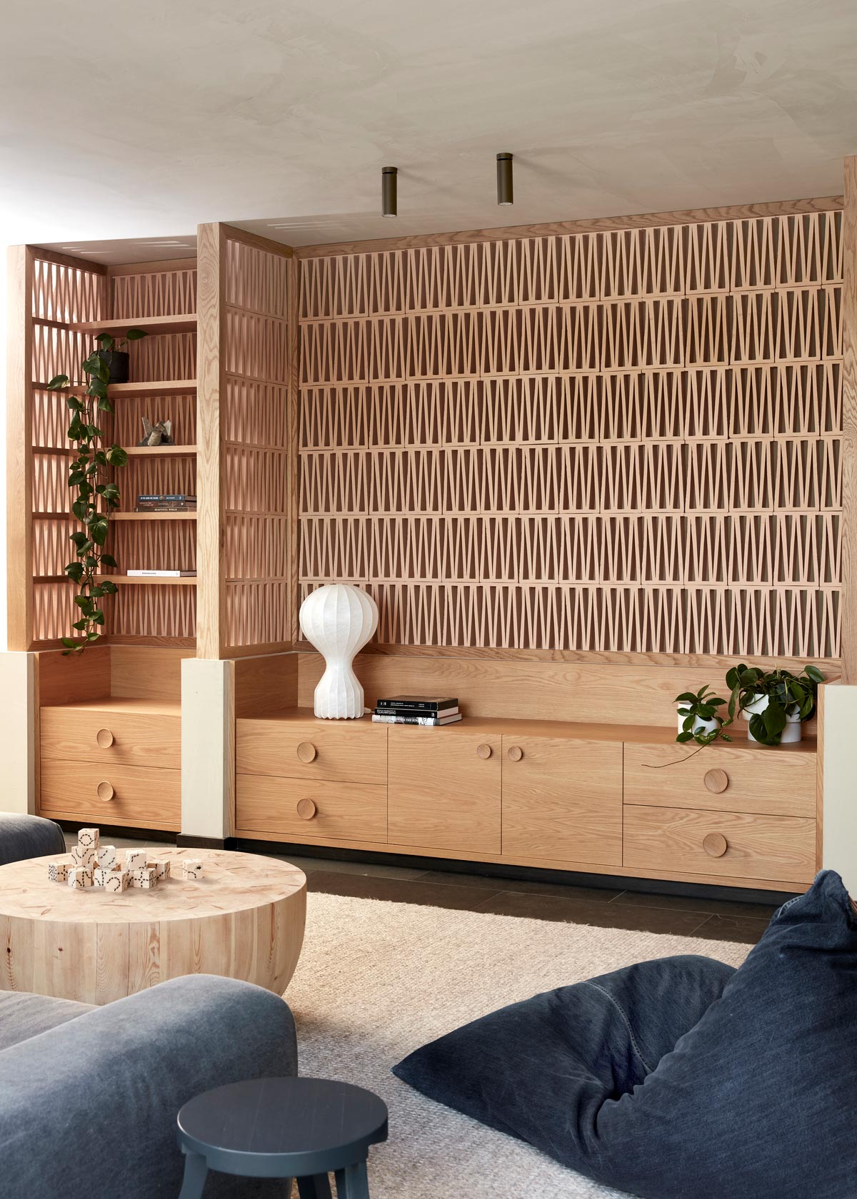 The colour palette was predominantly inspired by the magnificent colours of the valley and the surrounding landscape. Ghost greys of the eucalypts, the washed out greens of the grapevines, the terracotta blush of the soil and the blackened bark of the trees. Graphic elements like Patricia Urquiola tiles were used to wrap the kitchen walls and island bench to introduce a contemporary aesthetic to the interiors, along with the terracotta brick screen in the rumpus that throws light into an otherwise land locked hall. Texture and layering were paramount in this interior, and the hand of the artisan is felt throughout every inch of this home.
