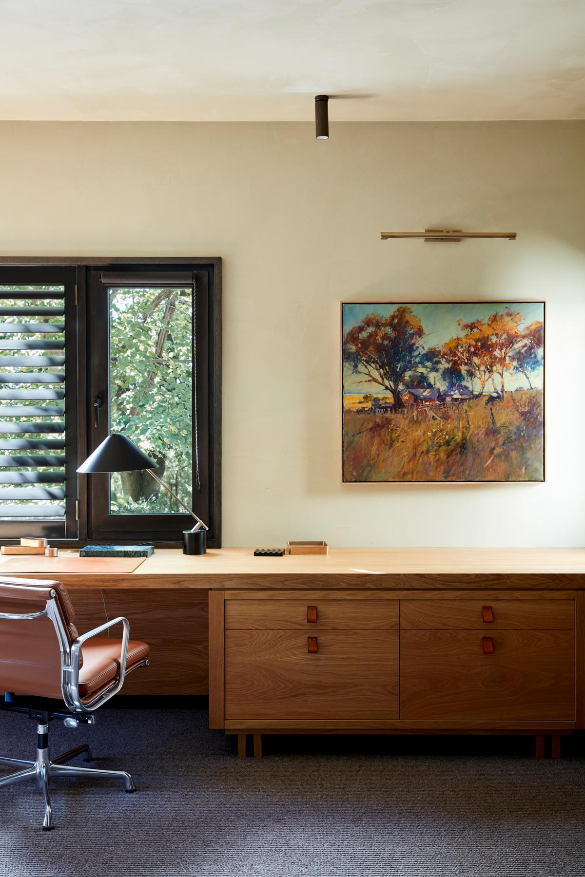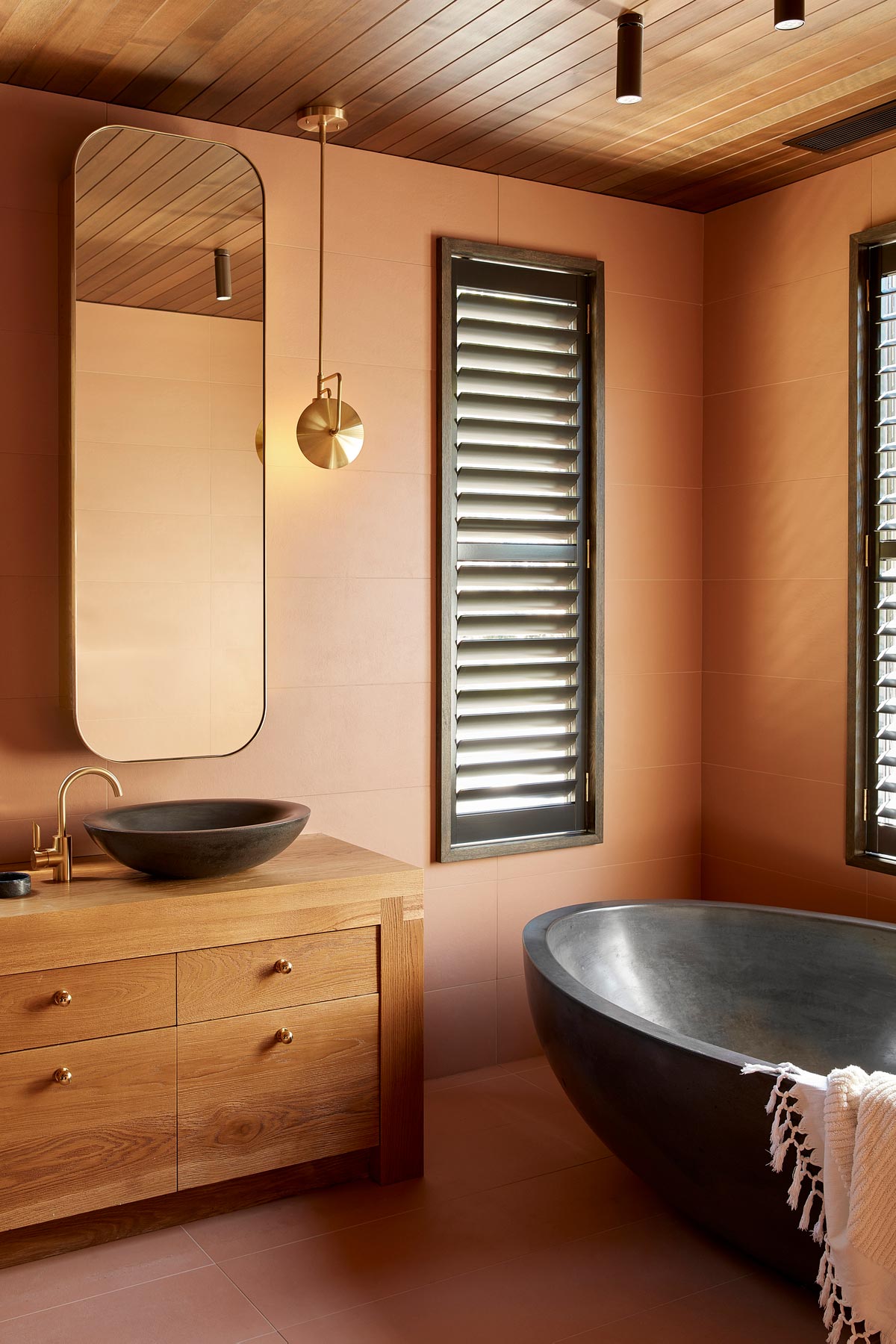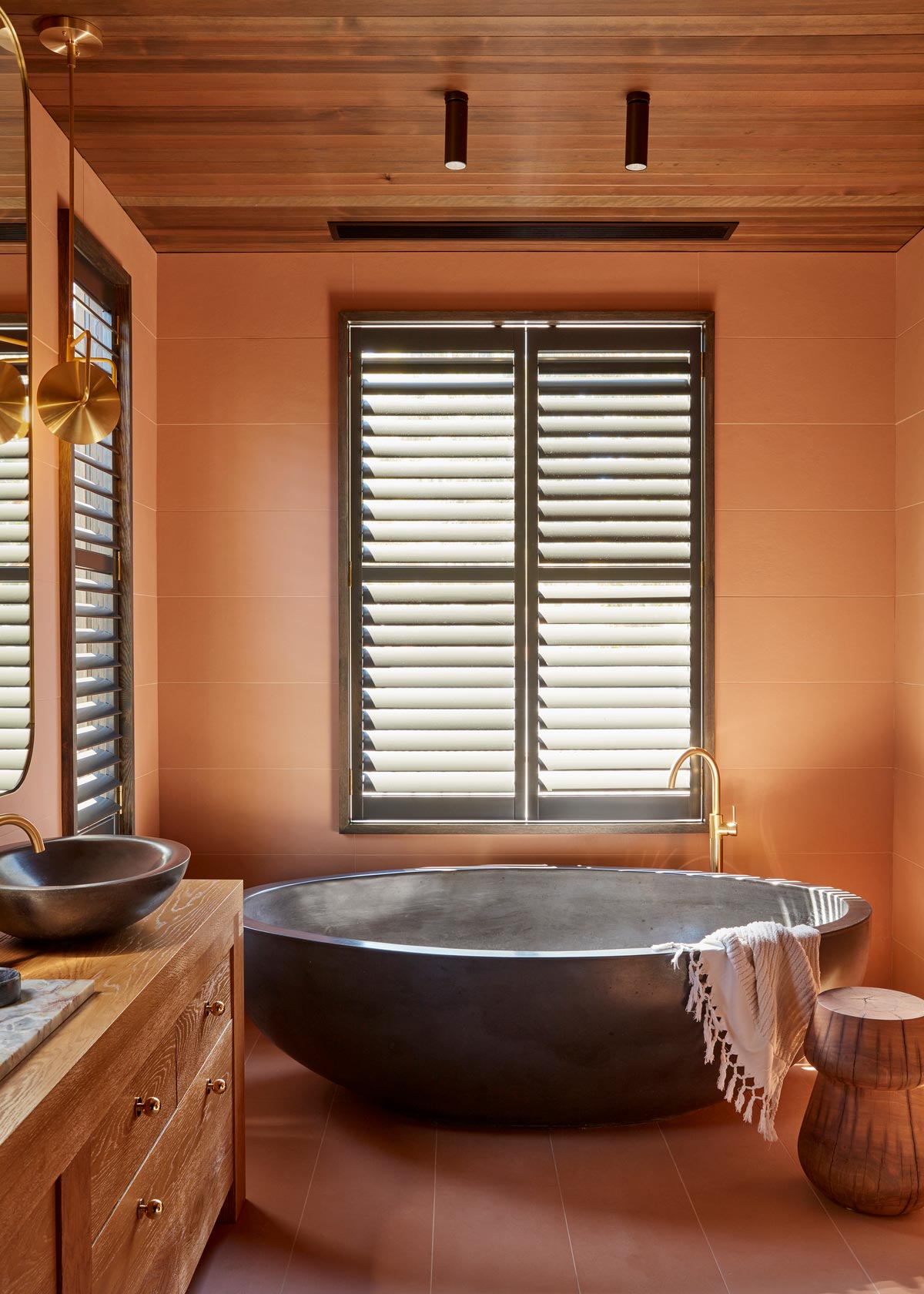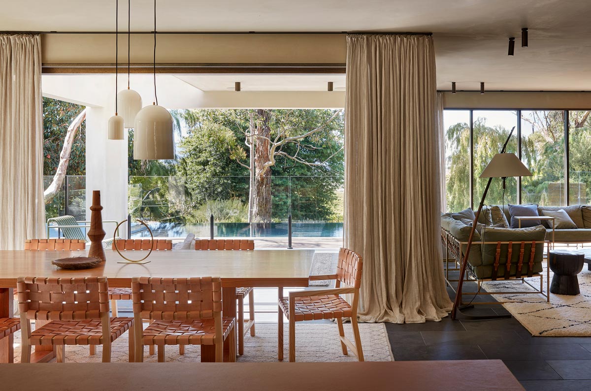 “It seemed an obvious thing to build the interior finishes around these colours to create a language with the landscape. Rich terracottas, saddle tan leathers, polished plaster, slate, cedar and sandblasted timber were used to effect a warmth and familiarity between inside and out. Limited by the low ceilings throughout, we coated all the walls and ceilings in polished plaster to create textural shade and bounce light onto the ceilings. We changed out all the windows, cleaning up repetitive runs with large picture windows to frame those fabulous views and bring the pool deck to life. We wrapped new renderings around the entirety of the house and in this way, it began to feel like a modern Australian country home.” – Chelsea Hing Interior Design Studio